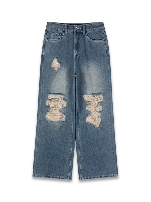 •  Lace Trim Distressed Jeans